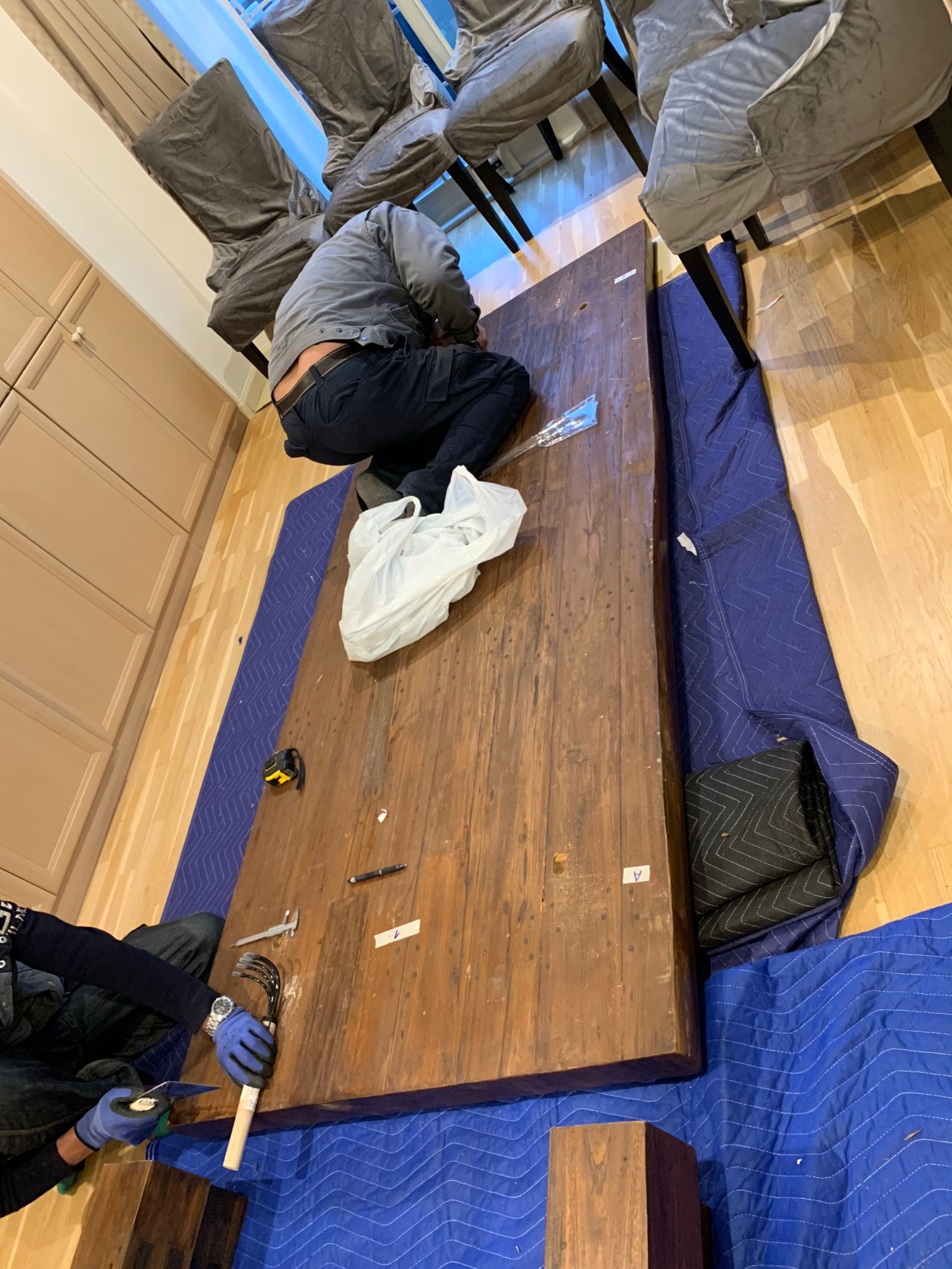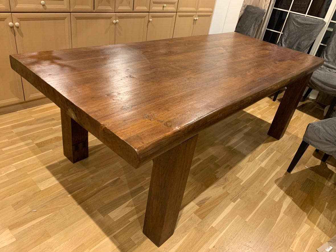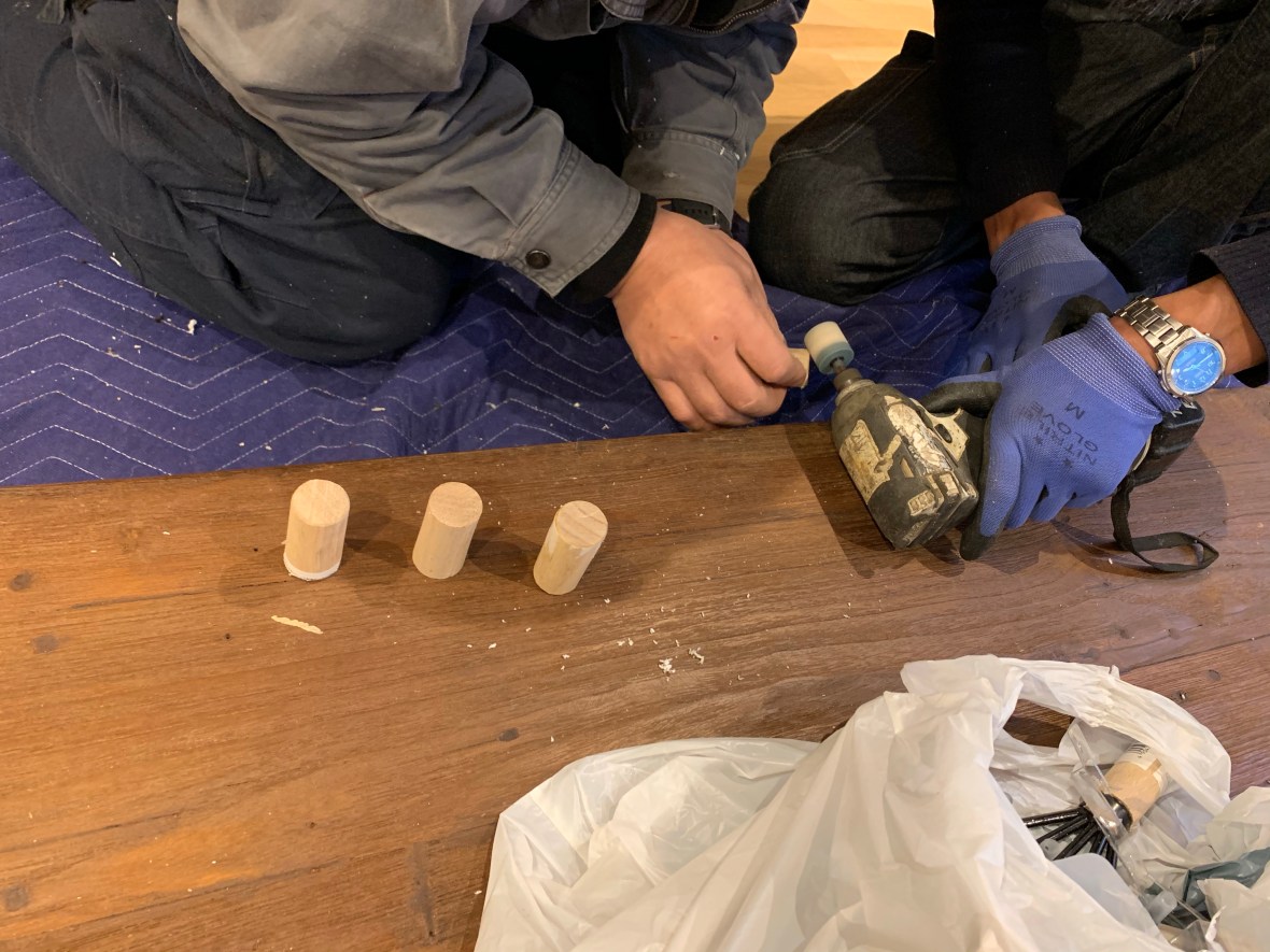 船便で海外から送られてきた重さなんと150kgのダイニングテーブル。切断された脚の修理取付けを依頼されました。